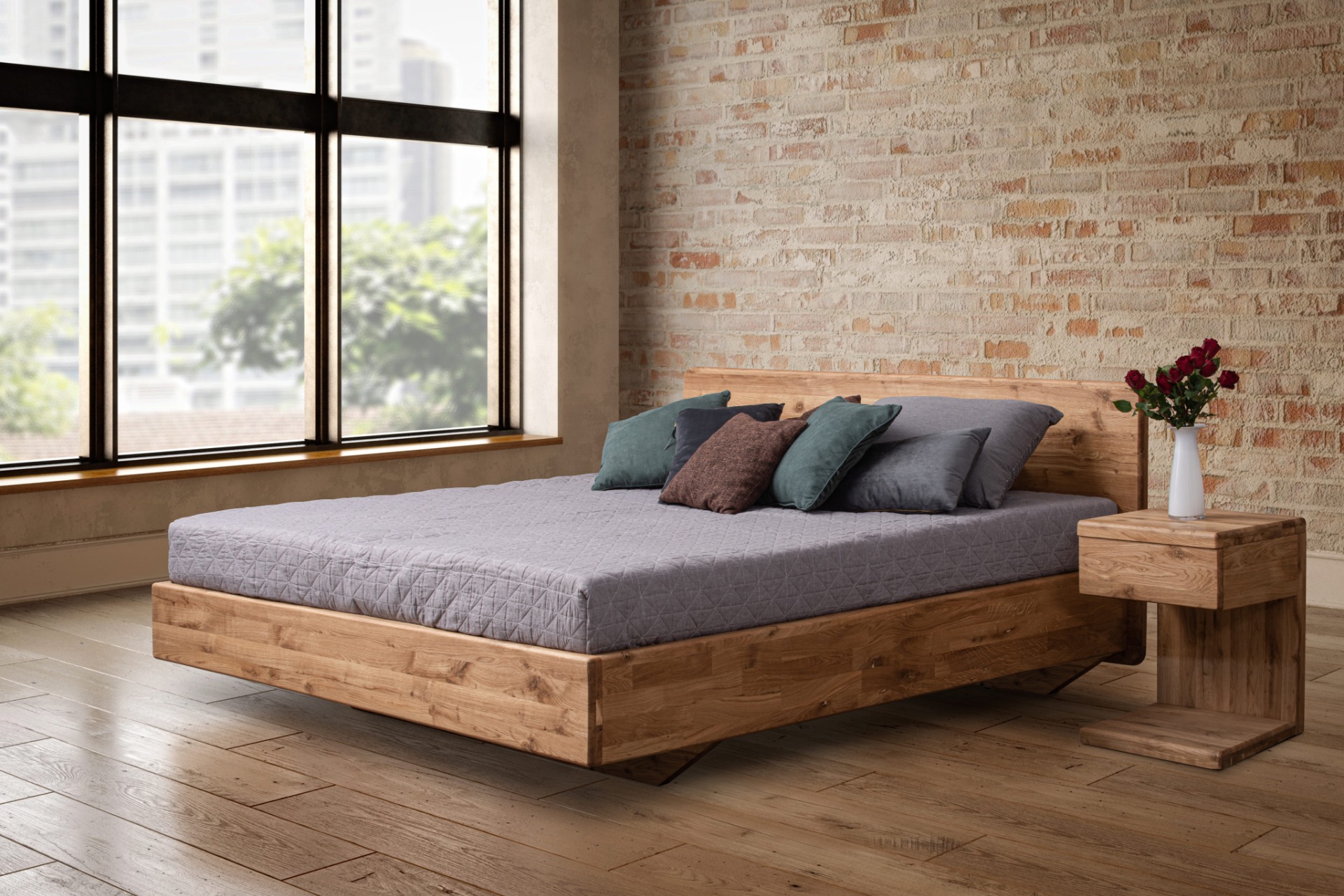 Postel z lamina v tuplovaném provedení, který působí jako masiv s čelem a koženou opěrkou. Pevný rošt. Tvořeno na zakázku s úpravou výšky roštu, která byla vyhotovena pro imobilního zákazníka tak aby odpovídala jeho výšce a mohl se pohodlně posadit na postel. Možno s přesahem čela postele s nočními stolky nebo bez.