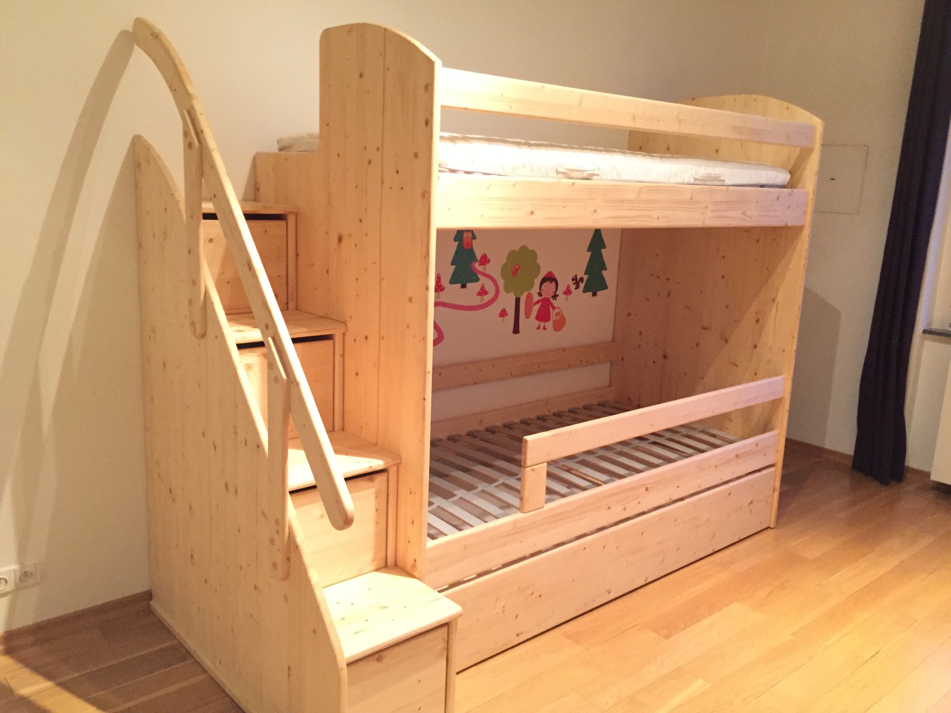 Dětská palanda z masivu s úložným prostorem pod roštem a uvnitř schodů pro hračky či textil.